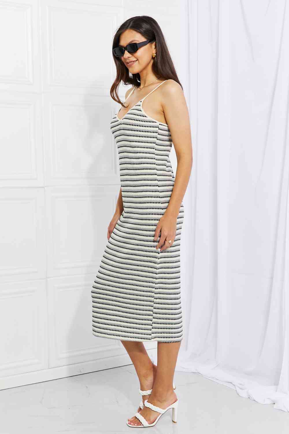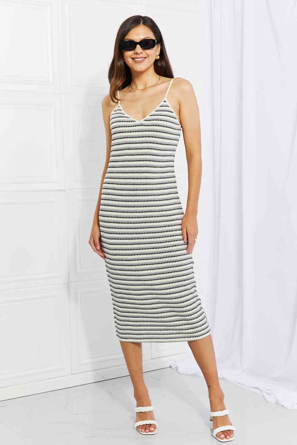 This Y2K-style dress will have you reminiscent of your younger years. Yarn-dyed stripes make up the body of the dress, which has a flattering straight silhouette. The long mid-calf length is right on-trend and can be styled for all seasons and any weather!