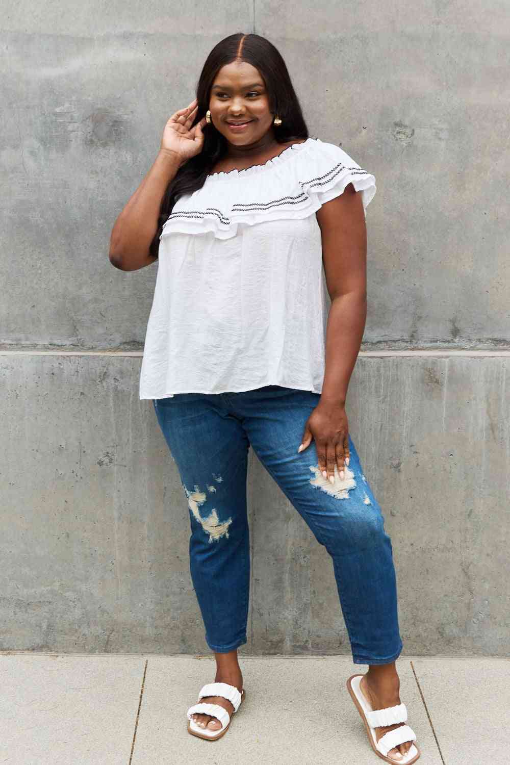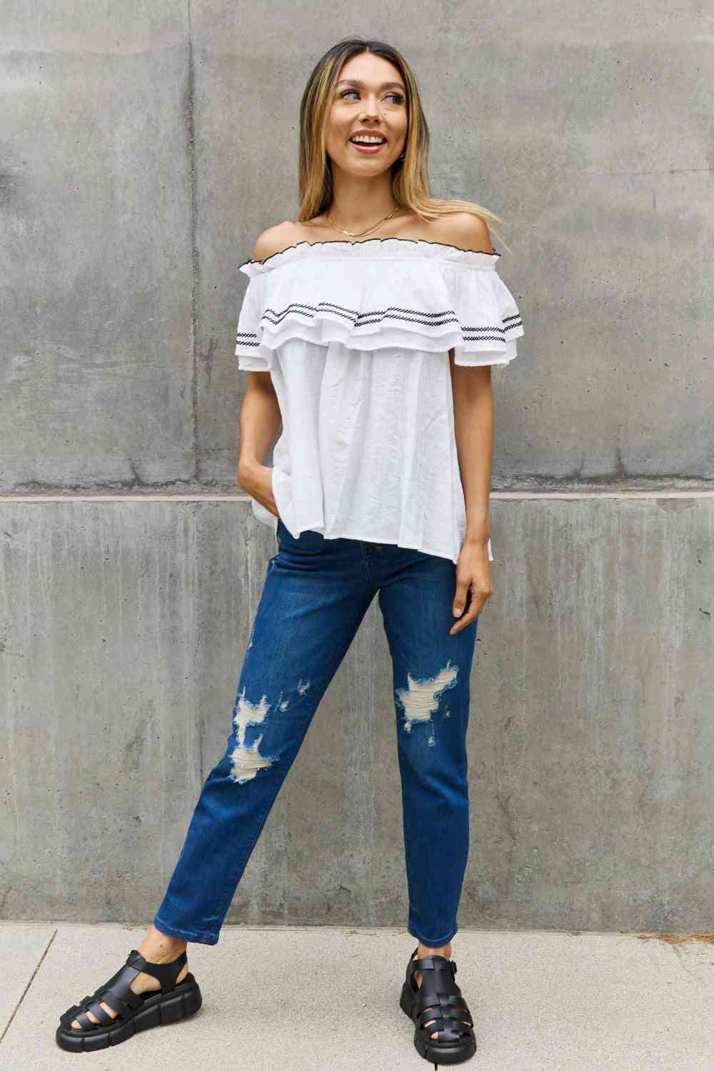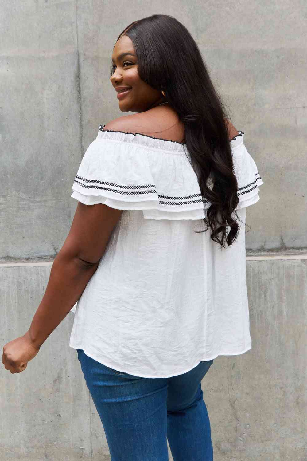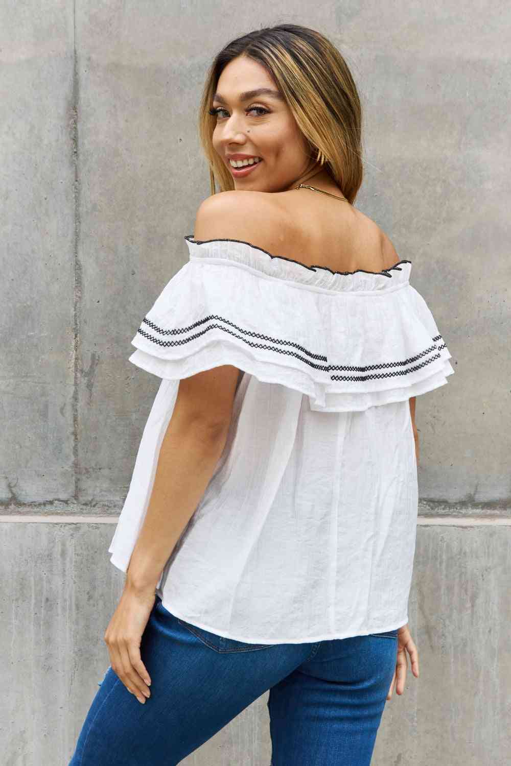 Introducing our stunning Ruffle Off-the-Shoulder Blouse with Contrasting Embroidery Detail, a fashion-forward piece that effortlessly combines elegance and style. This blouse is designed to make you feel like a true fashionista, with its unique features and exquisite craftsmanship.