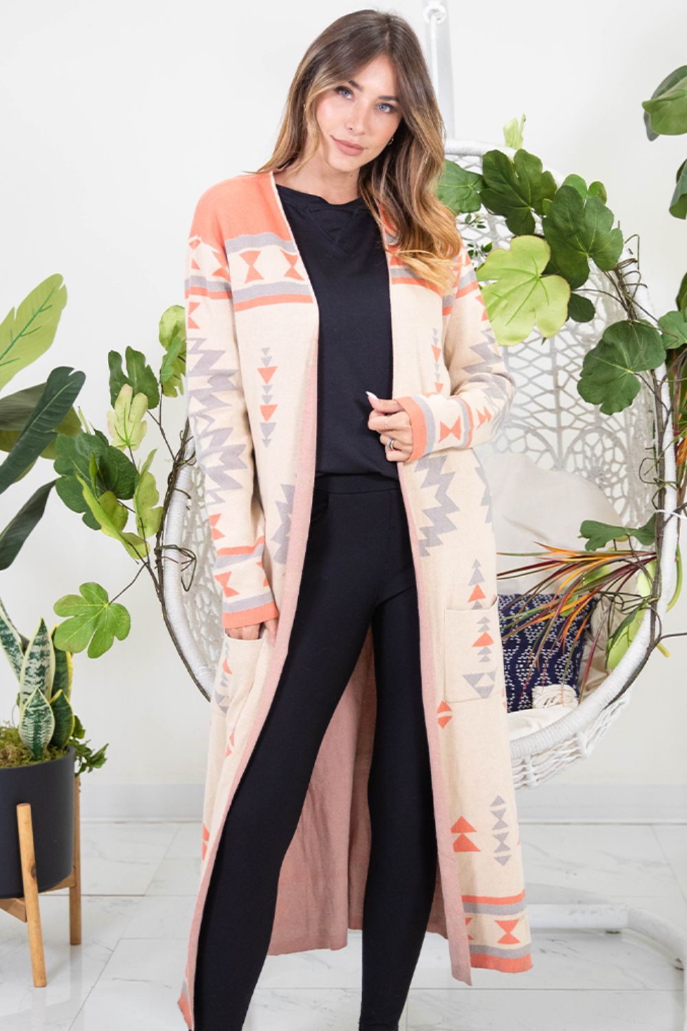 The Open Front Long Sleeve Geometric Longline Cardigan is a stylish and eye-catching layering piece that adds a touch of flair to any outfit. Featuring an open front design and long sleeves, this cardigan is perfect for adding warmth and style to your look. The geometric pattern adds a modern and chic element to the cardigan, making it a statement piece that can elevate even the simplest ensembles. The longline silhouette provides a flattering and elongating effect, making it a versatile option to pair with both casual and dressy outfits. Whether worn over a dress, with jeans and a basic top, or layered over a blouse and pants for a more polished look, this cardigan is a versatile and fashionable addition to your wardrobe.