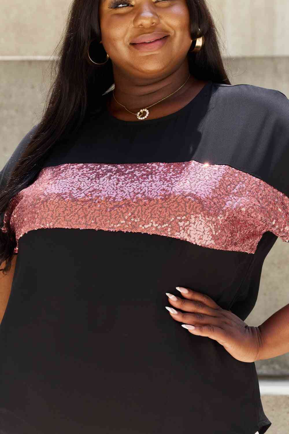 This exquisite piece is designed to make a statement wherever you go, whether it's a casual outing or a special occasion. This top features a contemporary silhouette with short sleeves, making it ideal for warmer weather or as a layering piece. The center mesh sequence design adds a touch of allure and sophistication, instantly elevating your overall look. The mesh sequence design is strategically placed down the center of the top, creating a captivating focal point that draws attention to your unique sense of style. The intricate detailing showcases a delicate balance between modern trends and timeless charm, ensuring you stay on-trend while exuding effortless elegance. The fabric is soft, lightweight, and breathable, allowing you to stay comfortable and cool throughout the day. The top is also designed to provide a flattering fit for various body types, accentuating your curves in all the right places. With its versatility, this top can be effortlessly paired with a range of bottoms, from jeans to skirts, creating countless stylish ensembles. Dress it up with tailored pants and heels for a chic evening look or keep it casual with shorts and sneakers for a relaxed day out.