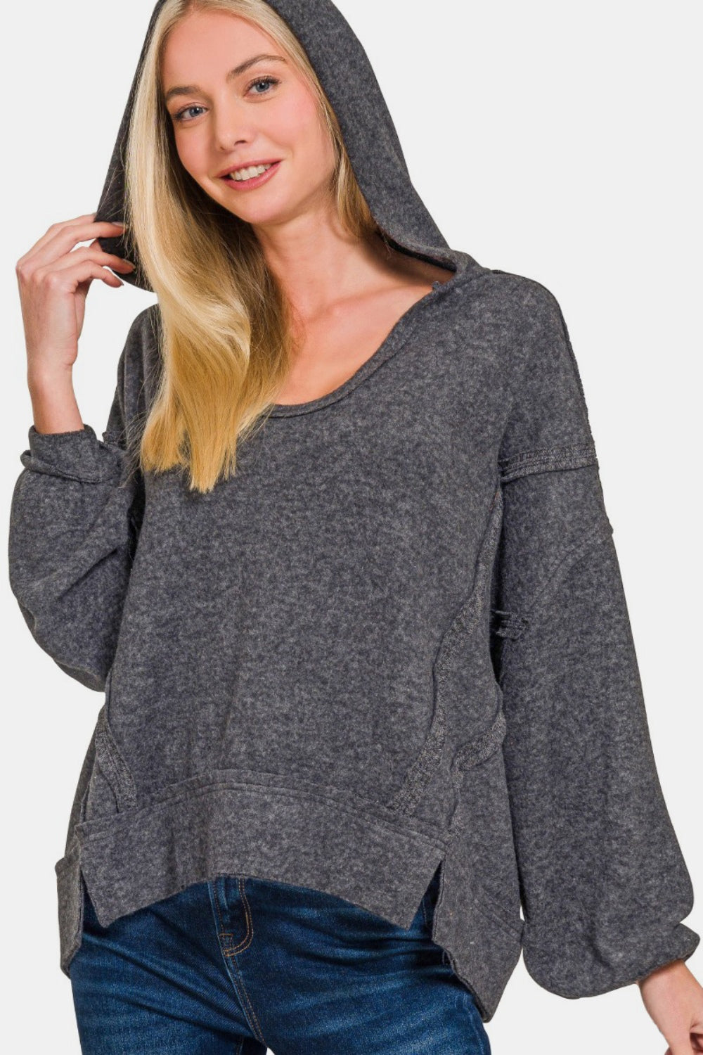 This brushed Hacci balloon sleeve hoodie features exposed seams for added detail and texture. The Hacci sweater material provides a cozy and soft feel, making it perfect for cooler days. The balloon sleeves add a touch of volume and style to the hoodie, creating a trendy and relaxed look. With the exposed seams adding a subtle but unique element to the design, this hoodie is both comfortable and fashion-forward.
